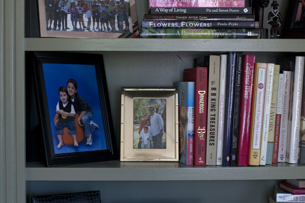 The blue bookshelf houses a collection of cookbooks, family portraits, and of course, The Dangerous Book for Boys.