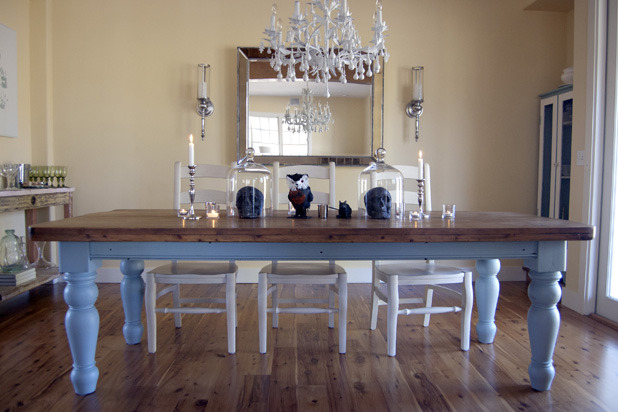 The statement dining table was discovered in an antique store in San Francisco some 15 years ago. "I fell in love with the table but didn't like the legs that originally came with it, so I searched another store and found the legs I liked. The owner was so sweet and switched out the legs for me," Diane said. Originally, the table was dark pine, but after moving into this house and painting the outside white, Diane decided to paint the dining table as well. "I wanted to bring the blue sky inside feeling my home," Diane said. Similarly, the chandelier originally sported bronze chain leaves, so Diane spray-painted the chandelier completely white to match the house's hues.