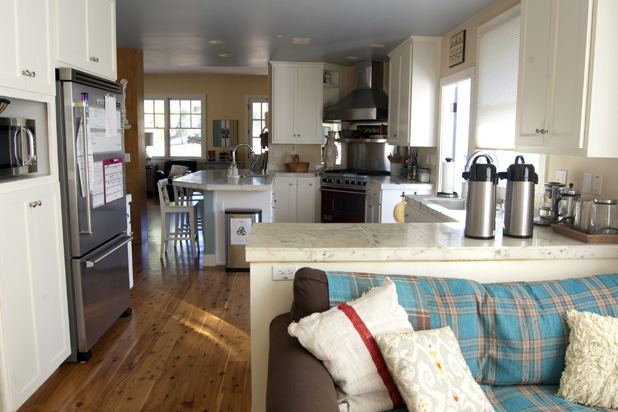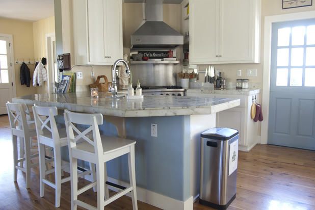 Other than the paint job, most of the inside kitchen remains the same. The previous owner was a caterer, and chose the marble countertops because the pattern reminded her of parsley; the Minas kept it.