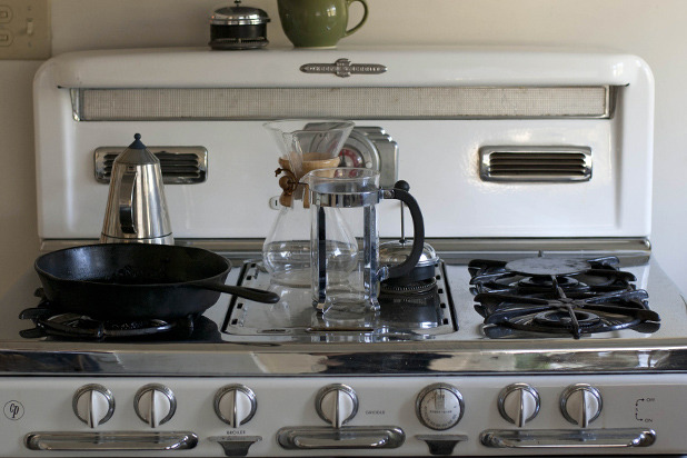 "I love waking up in the morning and making coffee on it," Tracht says of her vintage stove. Naturally, however, Tracht doesn't own a microwave. "My kids are all like, where's the microwave? It's right there," Tracht says, pointing at the oven.