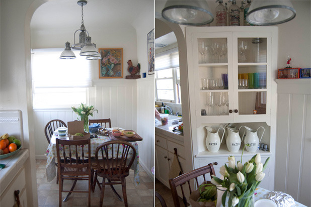 The breakfast nook is filled with antique finds. A sketch from a friend, a rooster from a Thailand market, and a painting from Paris line the ledge. The light fixtures were purchased from a second-hand store, while the hutch (right) holding the water jars also houses antique seltzer bottles. "I collected antique seltzer bottles for a while, but then I stopped because then I'd have a million of them," Tracht says.