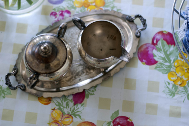 Meanwhile, a beautifully tarnished sugar and creamer set is prominently displayed on the kitchen table. "My mother gave them to me, I grew up with them," Tracht says.