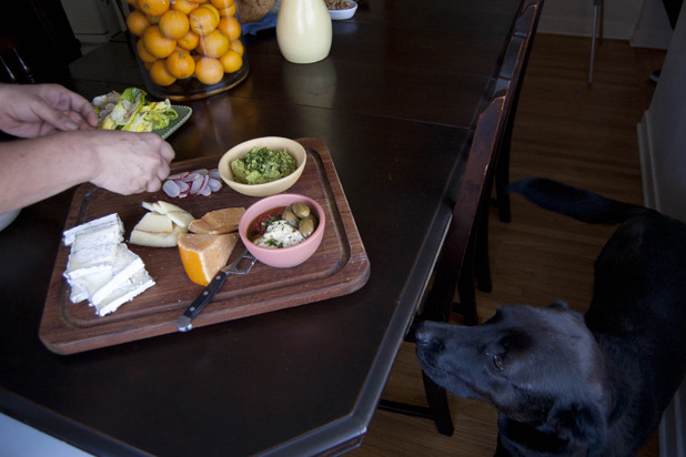 Juno (also known as Junebug) eyes a cheese and olive spread in the dining room.