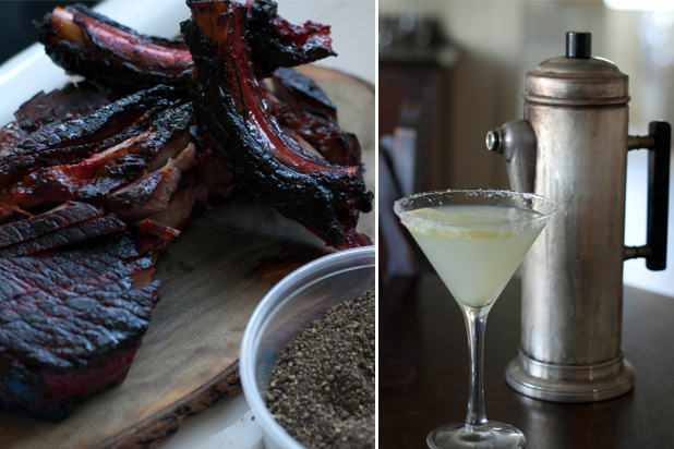 A closer look at the chashu pork (left), plus the drink of the day (right): The Lincoln. The white grapefruit and tequila concoction, whipped up by Jar bartender Margo Tyler, uses fresh-squeezed juice from farmers' market grapefruits. As for the vintage shaker? "I got that at an antique shop probably 20 years ago," Tracht says. "I love it; it has a 1950s vibe."