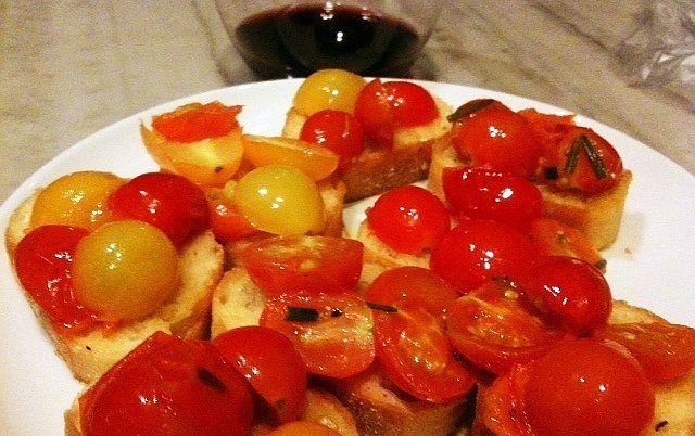 I love the concept of standing in the kitchen and chatting with a friend while whipping up some culinary masterpiece. I don’t know about you though, but that's not how it has ever really gone for me. Usually, I can’t think about anything but what I’m making, so my sentences often have random ingredients thrown in. But this dish — this bright, sweet, colorful dish — is the perfect drink-wine-while-chatting-and-cooking-all-at-once snack. Case in point: a good friend was in town, so I invited her to my place for a glass of wine and some snacks. (In this story, snacks = cherry tomato bruschetta.) We successfully stood at the kitchen counter, drinking a light California red, while I cooked up this extremely easy and tasty bite. It is a great appetizer or side dish and is virtually fool proof. The salt and the rosemary cut the sweetness of the tomatoes and the warm, slightly crispy (and salty) bread is the perfect carrier for it all. Click here to see more Tasty Tomato Recipes.