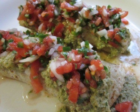 - Heat a sauté pan over medium heat. Add the remaining 1 teaspoon of oil, and heat the tortillas through, one by one, about 15 seconds on each side. Keep the tortillas covered. To assemble the enchiladas, take about 2 tablespoons of the filling and place it in the center of each tortilla. Roll the tortillas, and top with the sauce. If the filling has cooled to room temperature, place the assembled enchiladas back in the oven for about 10 minutes to warm through. Serve immediately topped with pico de gallo.