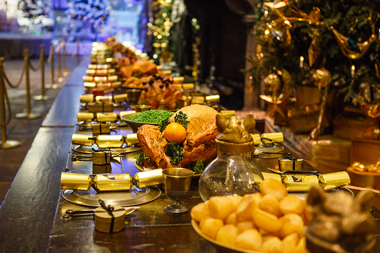 "The Great Hall will be lined with trees adorned with golden baubles shaped like moons and partridges, while a replica feast complete with flaming Christmas puddings will dress the long tables," the website notes.