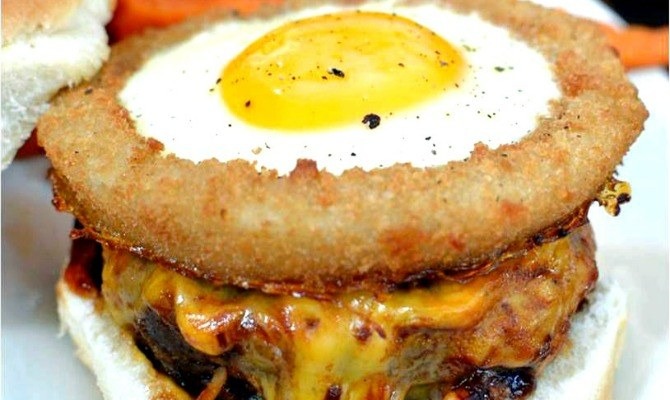 Stephanie who blogs as (The Cozy Cook) made this delicious cheese burger with an egg inside an onion ring. You have a cheesy burger, crunch from the onion rings, and a creamy fried egg. The presentation is spot-on too.