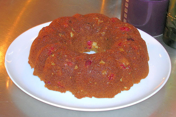 This recipe brings out the best of fall-flavors with apples, walnuts, and cranberries. And in order to help you create the perfect cake, Walt Alper shared some of his best baking tips with us. . He points out that cakes for which granulated sugar has been replaced with other sweeteners, do not brown or rise the same way as when using "regular" sugar. As this cake uses a sugar substitute as sweetener, Alper uses sour cream, baking soda, and vinegar, to help it ride and become "fluffier." He also replaced 1/4 of the flour with ground nuts to cut the carbohydrate count. And as an extra bonus, the nuts add more fiber and protein.