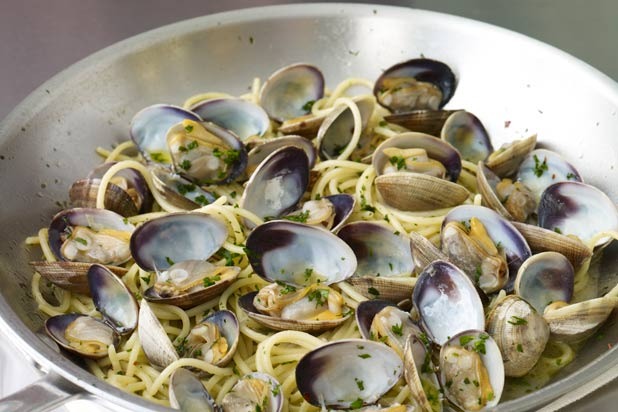 This is a classic dish of spaghetti dressed with clams steamed in white wine, seasoned with garlic, and red pepper flakes.