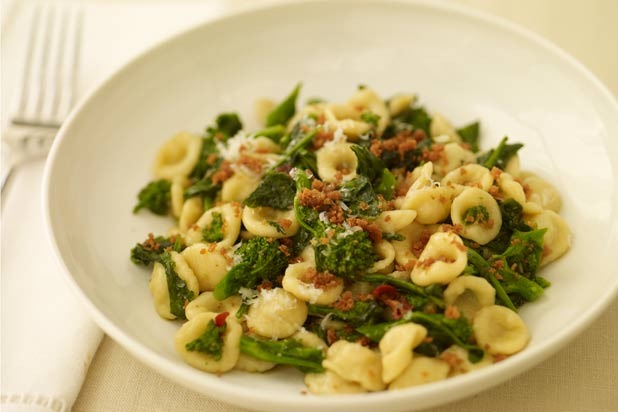 The orecchiette are sauced with broccoli rabe that is cooked in olive oil seasoned with garlic, red pepper flakes, and chopped anchovy. The dish is finished with grated pecorino and fried breadcrumbs. Crumbled sausage may be added; it also balances the bitterness of the broccoli.