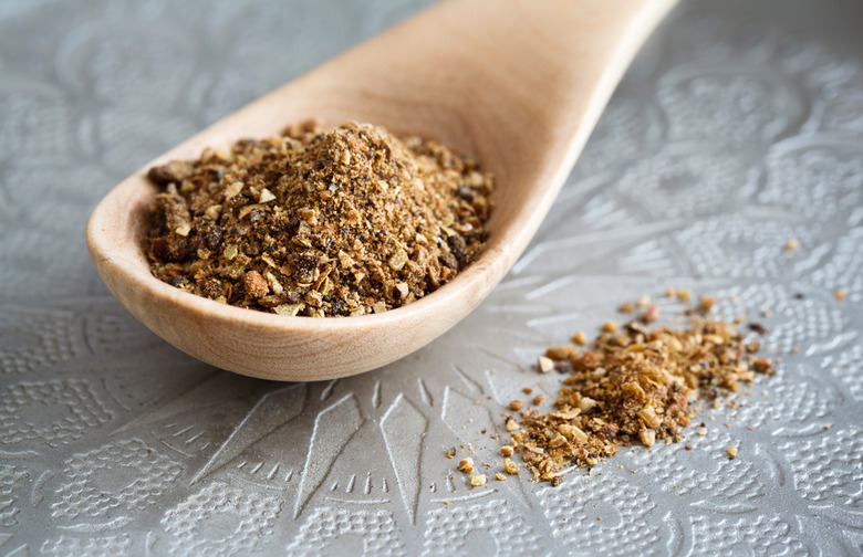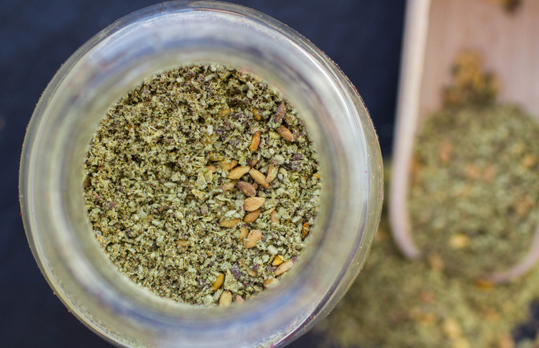 Here is our interpretation: 2 tablespoon thyme, 1 tablespoon cumin, 2 tablespoons sesame seeds (toasted), 2 teaspoons sumac, ½ teaspoon black pepper, and ½ teaspoon salt.