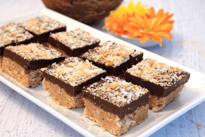With inspiration from the Almond Joy candy bar, 2 Cookin Mamas' no-bake bars are rich, filled with creamy almond butter and toasted almonds, and everything you could want in a dessert.