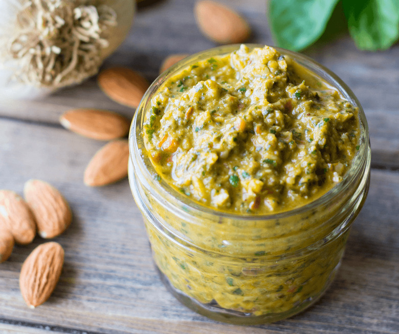 Almonds can be a great, flavorful substitution for pricey pine nuts in a traditional Sicilian pesto. As Coley Cooks writes, "This pesto is delicious tossed with pasta, smeared on bread, or as a sauce for meats, seafood and vegetables."