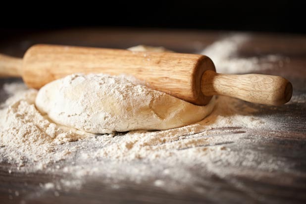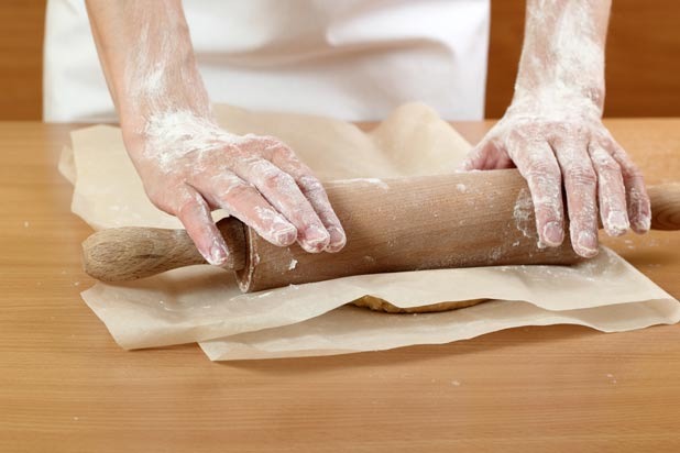 A great way to deal with sticky pizza dough is to roll it out onto a piece of parchment paper. Leave it on until midway through baking in the oven — the liner should easily release from the pizza dough.