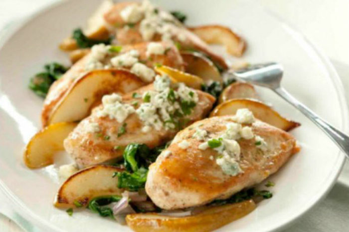 Click here for the Baked Chicken with Spinach, Pears, and Blue Cheese recipe.