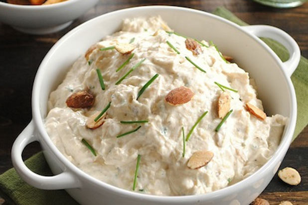 Roasted garlic and almonds are mixed with Greek yogurt for a delicous and healhty dip.