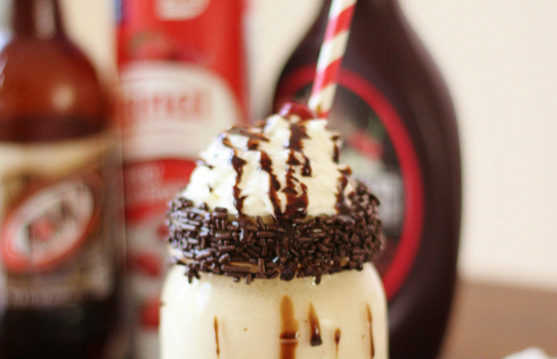 Fancy this float up a bit by whipping it all together in the blender, and then putting chocolate sprinkles on the rim of the glass and adding some whipped cream. But if you're not inclined to get that fancy, you can totally just do the ice cream and root beer portion of this recipe and skip the rest.