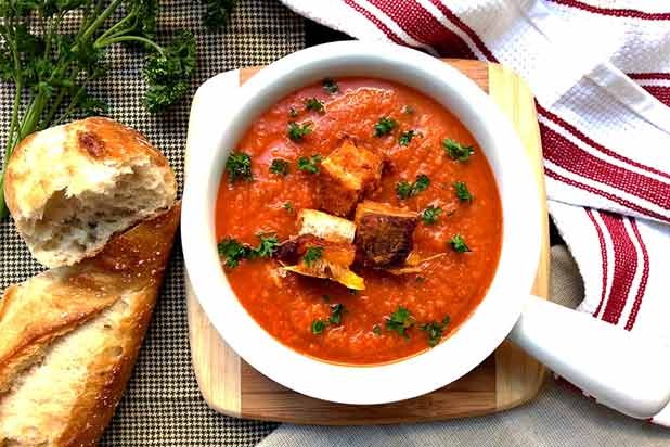 Tomato Soup with Grilled Cheese and Bacon Croutons Recipe
