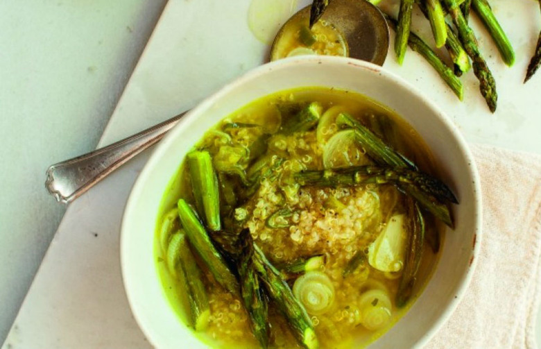 This soup is everything I want from a spring meal. Its broth is infused with the sweetness of spring onions, and high-protein quinoa adds just enough body to satisfy. I roast the asparagus first and add it last so that it retains its taste and texture, adding another dimension to this soup that always hits the spot. — Terry Walters, Eat Clean. Live Well