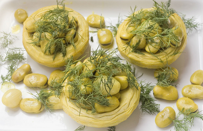 Fresh artichoke hearts are poached in olive oil and lemon juice before being served with broad beans, almonds, and dill.