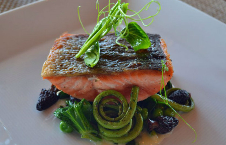 Pan-Roasted Salmon with Morel Mushrooms, Fiddlehead Ferns, and English Peas
