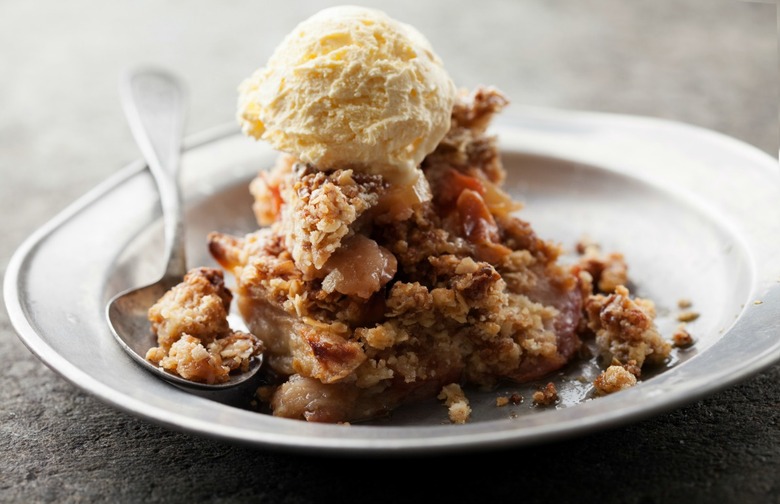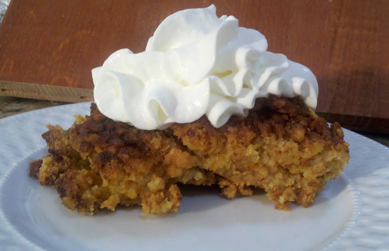 This recipe uses Betty Crocker cake mix to create the crisp crumble topping.