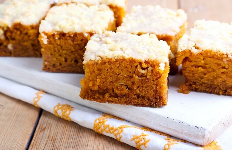 It is spread on top of the spiced pumpkin filling to form a crumbly crust on this scoopable cake.
