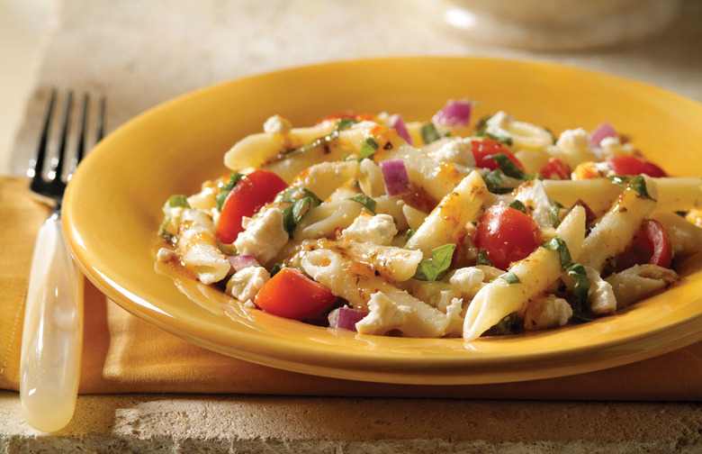 Full of Mediterranean flavors from the feta, fresh tomatoes and basil, this dish rivals the grilled chicken pasta salad at your favorite restaurant. Click here to see the recipe.