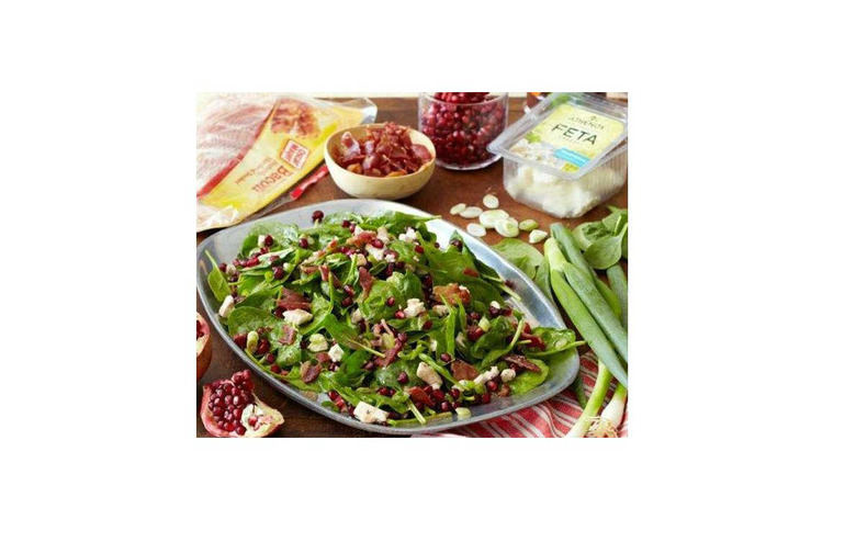 What makes this spinach salad special? 1. Pomegranate seeds 2. Crumbled feta 3. BACON! Click here to see the recipe.