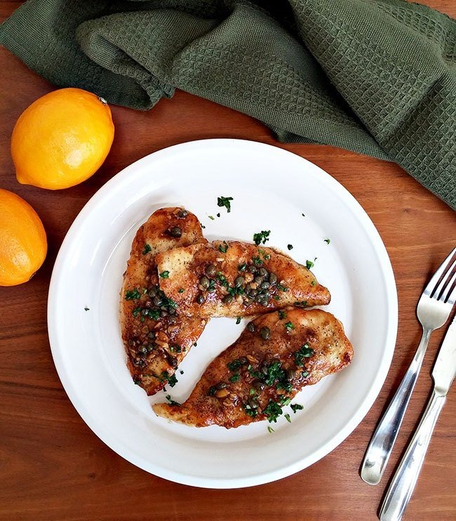 Cherry on My Sundae makes a quick lemony sauce for her pan-fried chicken breasts with Meyer lemon juice and zest, chicken stock, and capers and parsley for garnish.