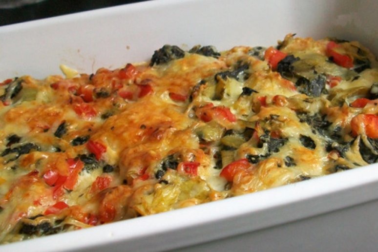 Sweet bell peppers are balanced by briny artichoke hearts and robust spinach. This crowd-pleaser is quick to prepare and ideal for a family brunch. — Meatless Monday