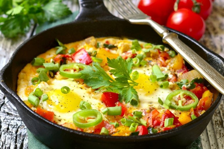 First, sauté your favorite spring vegetables you picked up at your local farmers market. Then top with your eggs and fresh herbs, and finish in the oven for a delicious, fragrant springtime start to your Mother's Day.
