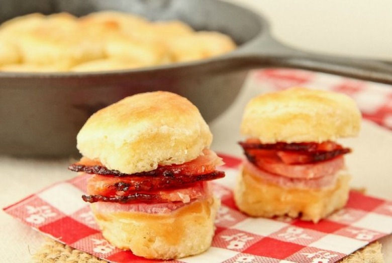 Savory ham gets nestled into delicious warm biscuits straight out of the oven; add maple mayo for a sweet and savory snack.