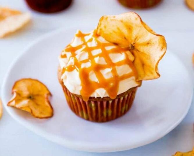 Apple spice, salted caramel, whipped cream; what's not to love? Top these cupcakes with an extra drizzle of salted caramel and a crispy apple chip for the perfect finish.
