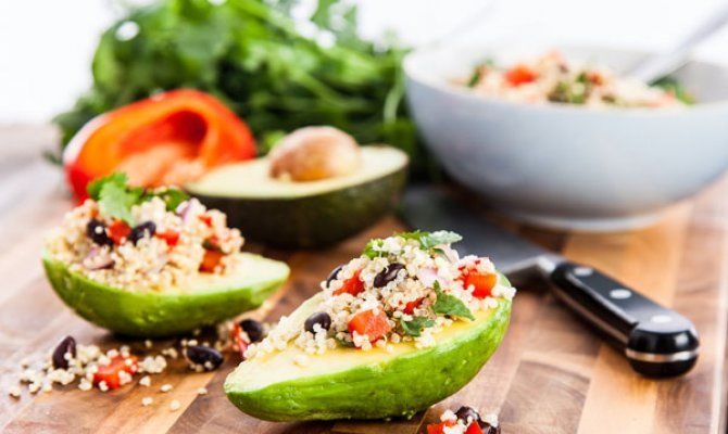 If you love the fresh flavors of guacamole, add this Mexican-inspired quinoa salad to a hollowed out avocado and call it a meal! Cooked quinoa is combined with corn and black beans before being flavored with a smoky cumin, cilantro, and lime dressing. You can even add tomatoes and red onion to the quinoa for more color and flavor.