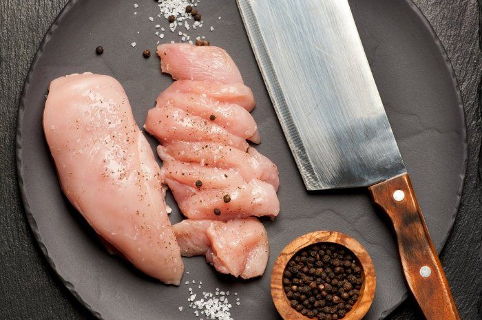 If you're going to slice your chicken before cooking it, make sure you're slicing against the grain, or across the chicken breast in the direction that will produce shorter strips. All meat — including poultry — is made up of bundles of tough muscle fibers, and cutting those fibers apart will produce a more tender piece of cooked chicken.