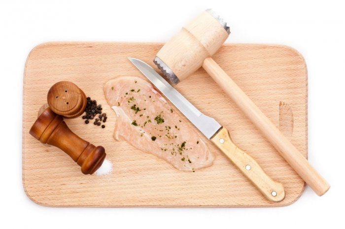 One of the inherent problems with breast is that one end is much thicker than the other. The amount of time needed to fully cook the thickest part of the chicken is much longer than what's needed for the thinner section, leaving it overcooked and dried out. An easy fix? Use a heavy object, like a rolling pin, to pound and flatten each piece of chicken to make it one, uniform thickness.