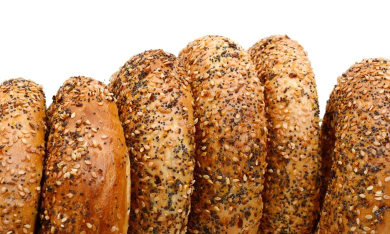 In a surprising twist for anyone who was born in the '80s or later, the everything bagel was not always available everywhere. This iconic bagel variety, which combines, poppy seeds, sesame seeds, onion, garlic, and caraway seeds, came into existence in 1980, if you believe David Gussin, who claims to have invented the everything bagel by accident when he was working at a "take-out place" in Howard Beach as a teenager according to reporting in a New Yorker article from 2008. Of course, if you believe Seth Godin, who worked in a factory in Buffalo producing everything bagels in 1977, then Gussin's story falls flat.
