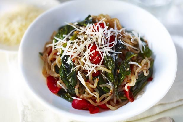 This spaghetti is a carbohydrate-free pasta that you find in health stores. It may not be everyone's cup of tea but it can be helpful when you want a "proper" plate of food for less than 100 calories. Don't be put off by the weird smell when you first get it out of the packet — rinse the spaghetti thoroughly in warm water and the smell will disappear.