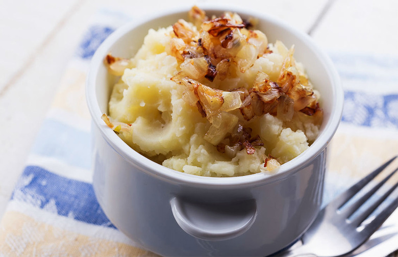 Improve your basic mashed potatoes by adding softly caramelized onions and plenty of olive oil.