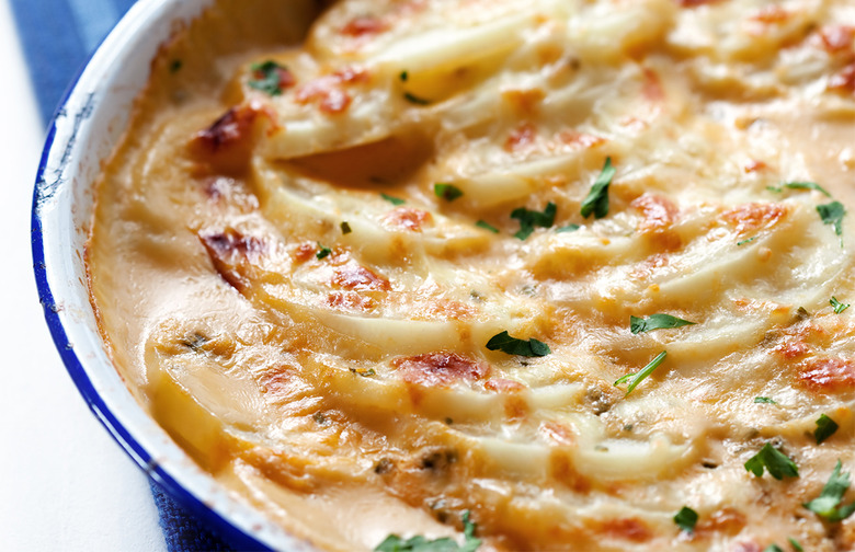 Caramelized onions layered between slices of potato are already a good start. Add salt, pepper, and 2 cups of half-and-half into the mix and you've got a wonderful, indulgent, and tasty dish.
