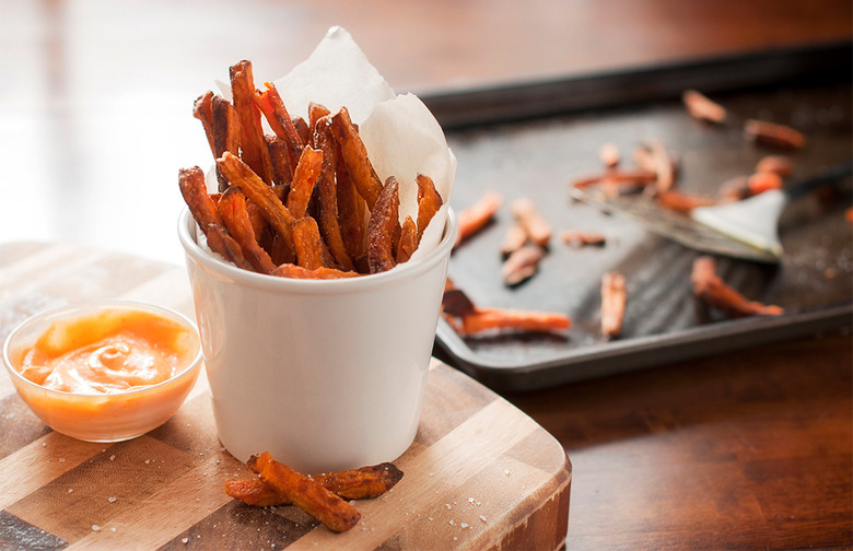 Skip the ketchup and dip these tasty sweet potato fries into a creamy mango sauce that mellows out the spicy chili coated fries.