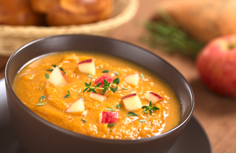 Spicy curry powder and tart apples pair perfectly with sweet potatoes in this warm and comforting soup.