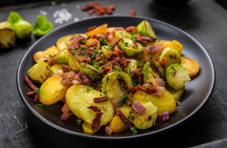 Crunchy bacon combines with chewy beer-roasted Brussels sprouts and potatoes to create a hearty side dish.