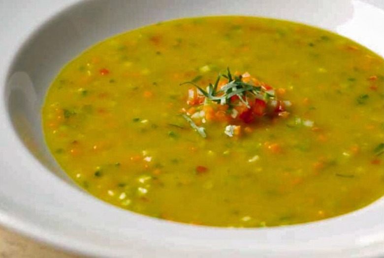 Pear and Sweet Corn Soup With Basil-Macadamia Pesto