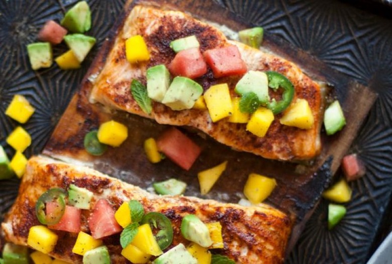 Salmon is in season in August, so enjoy it grilled on a flavorful wooden plank and topped with a light and refreshing fruit salsa. This salsa is made with mango, watermelon, serrano peppers, and fresh mint. Find the recipe here.