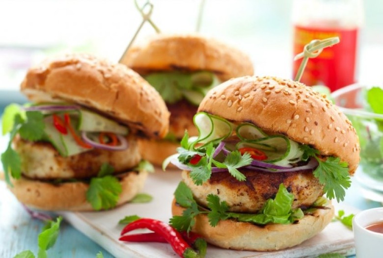 These healthy turkey burgers are anything but boring. Topped with sliced red onion, ribbons of crisp cucumber, and fresh cilantro, this tasty turkey burger recipe is sure to be a hit at any cookout.