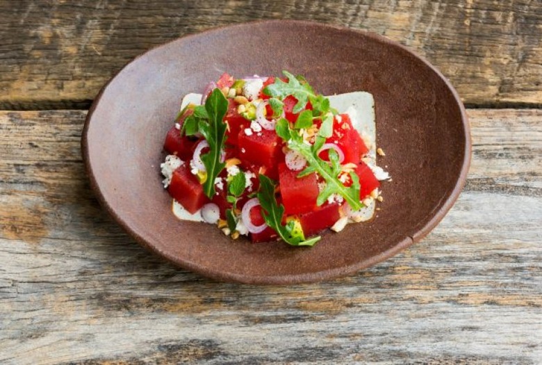 This seasonal dish completely encompasses summer's zesty and bold flavors: juicy watermelon, Greek feta, avocado, red onion, all tossed in mint vinaigrette. Get the recipe here.