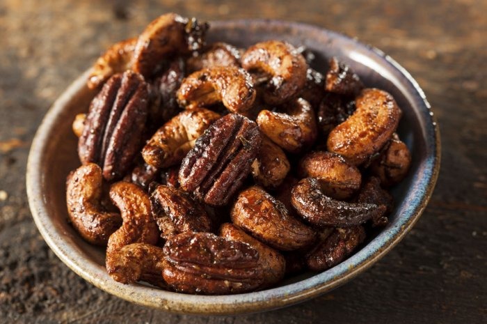 Take a cup of raw nuts (almonds work well) and toast them in a skillet over medium heat for 5 to 6 minutes. Then, reduce the heat to low and add a tablespoon of sugar, a tablespoon of honey, and a pinch of cinnamon or chili powder to the pan. When the sugar melts, stir the nuts until the sugar starts to crystalize around them. Pour the sugar-coated nuts onto a parchment-lined sheet pan, sprinkle them with salt, and allow them to cool completely. If you choose almonds, snack on 16 for a 150-calorie treat and save the rest in an airtight container at room temperature.